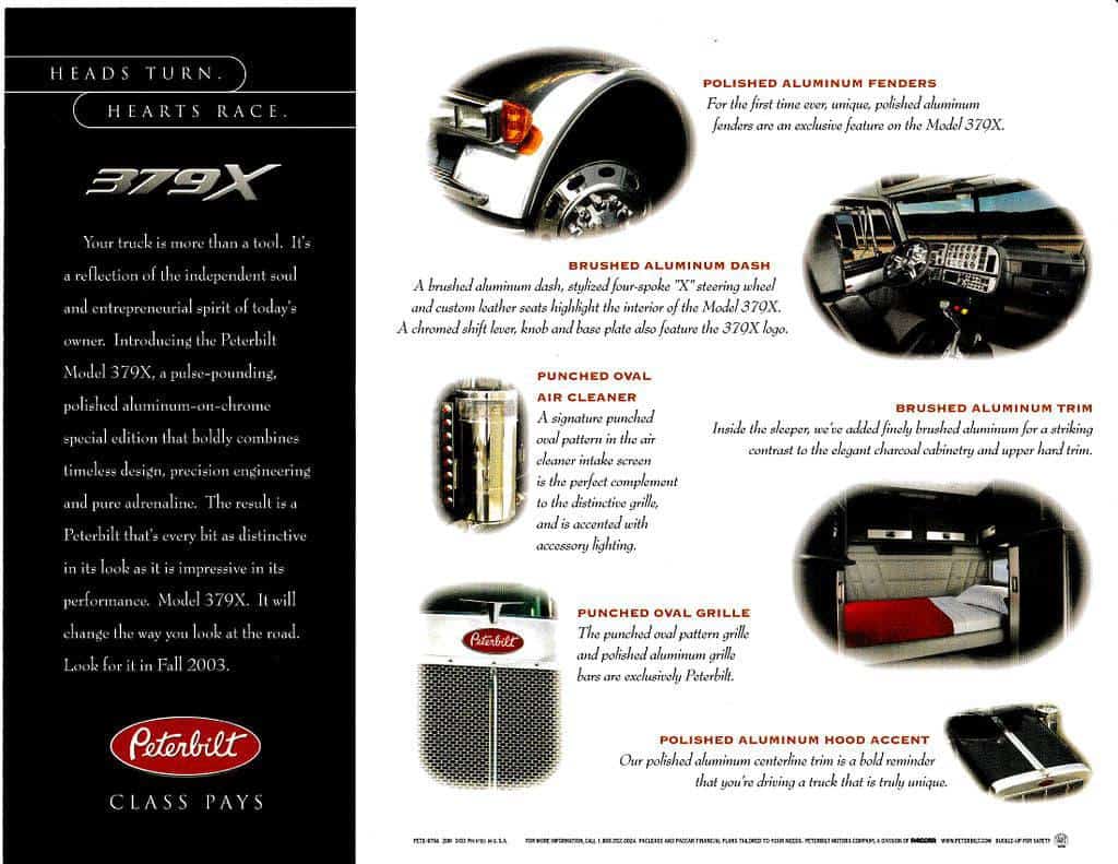 This 379X model was only offered with a caterpillar engine mated to a 18 speed transmission. The Standard 379X special Edition rolled off dealer lots with a 550 horsepower power plant, but with a special request owner operaters would bump the power up. The 379X was only available with a 70 inch unibilt sleeper ultra cab and was not offered in a tri-axle ,lift axle configuration.Any Lift axle configurations seen on the 379x was retro fitted by a private shop. All units produced as a 379X came with the extended hood which was bbc 127 inches. The regular 379 models came standard with bbc 119 inch hoods.