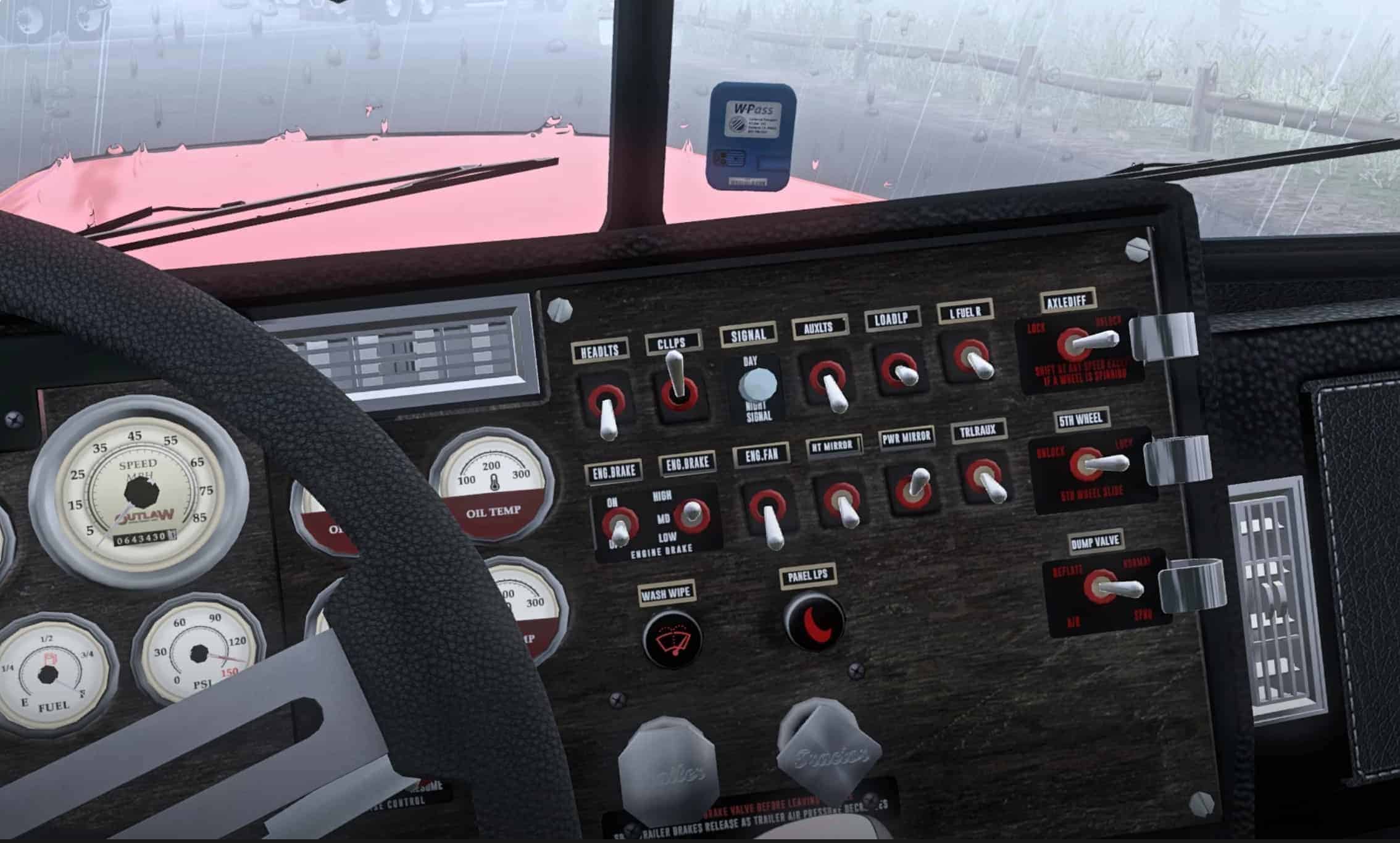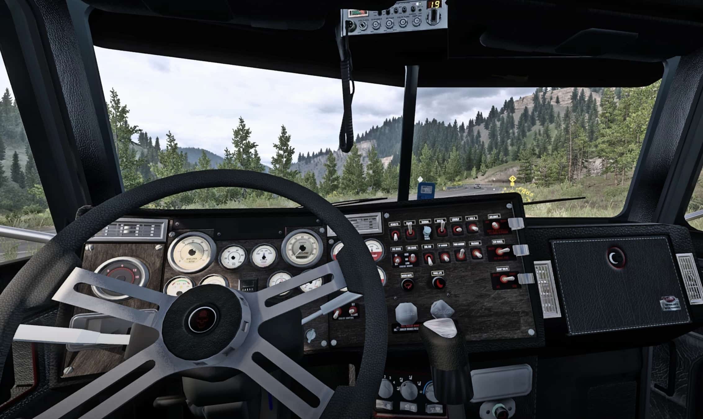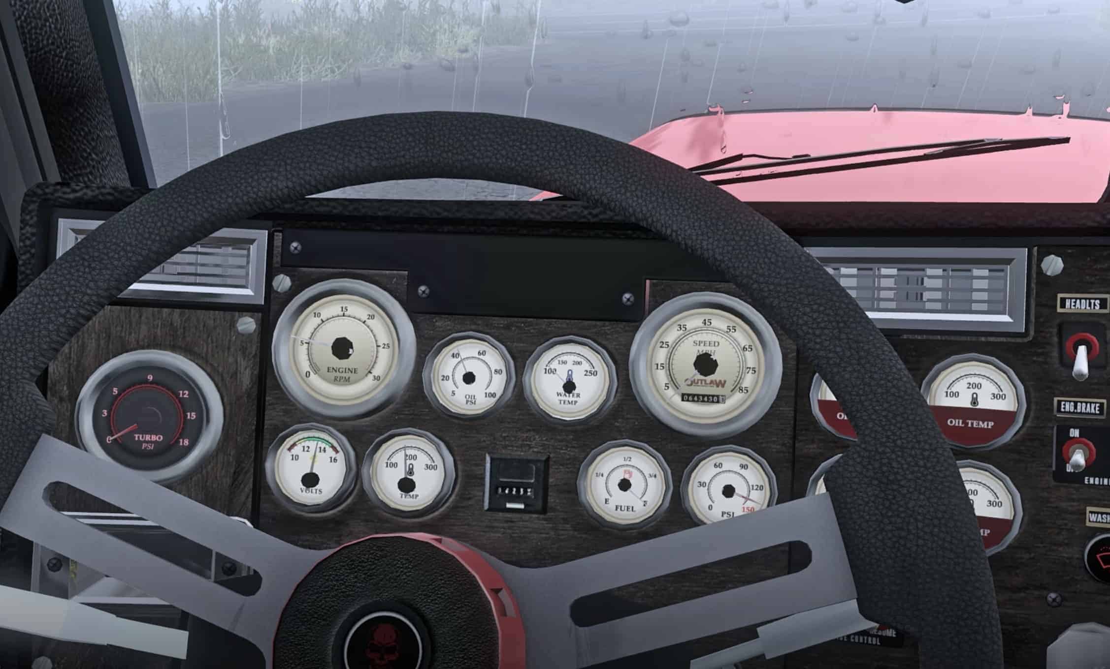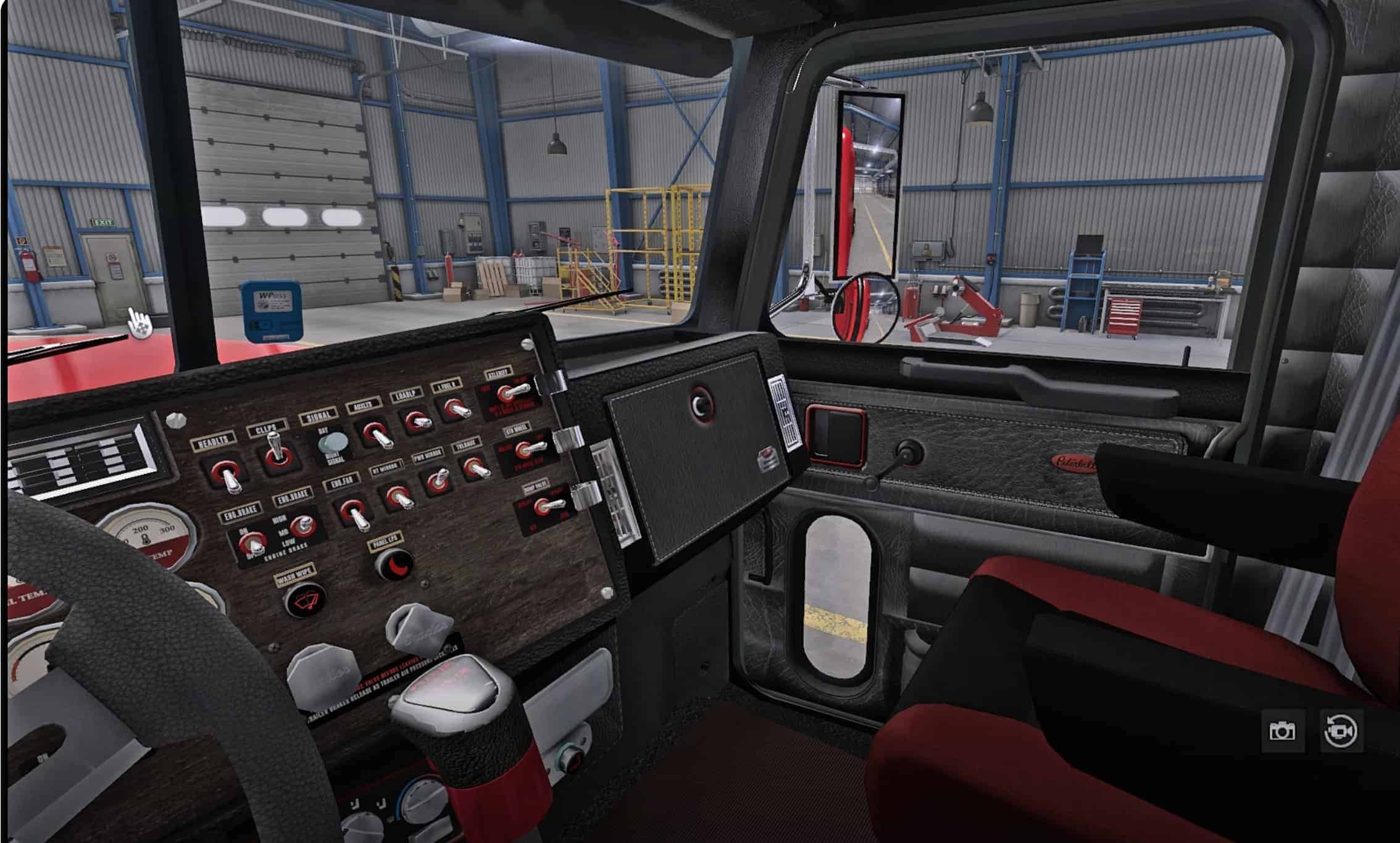 More or less every texture that you can see in the cab has been improved with serious attention to detail. Switches, lights, gauges, chrome, dashboard, door sides, steering wheel, panels, flooring, wood and electronics are redesigned in MUCH higher quality in a grey/black/red color scheme.