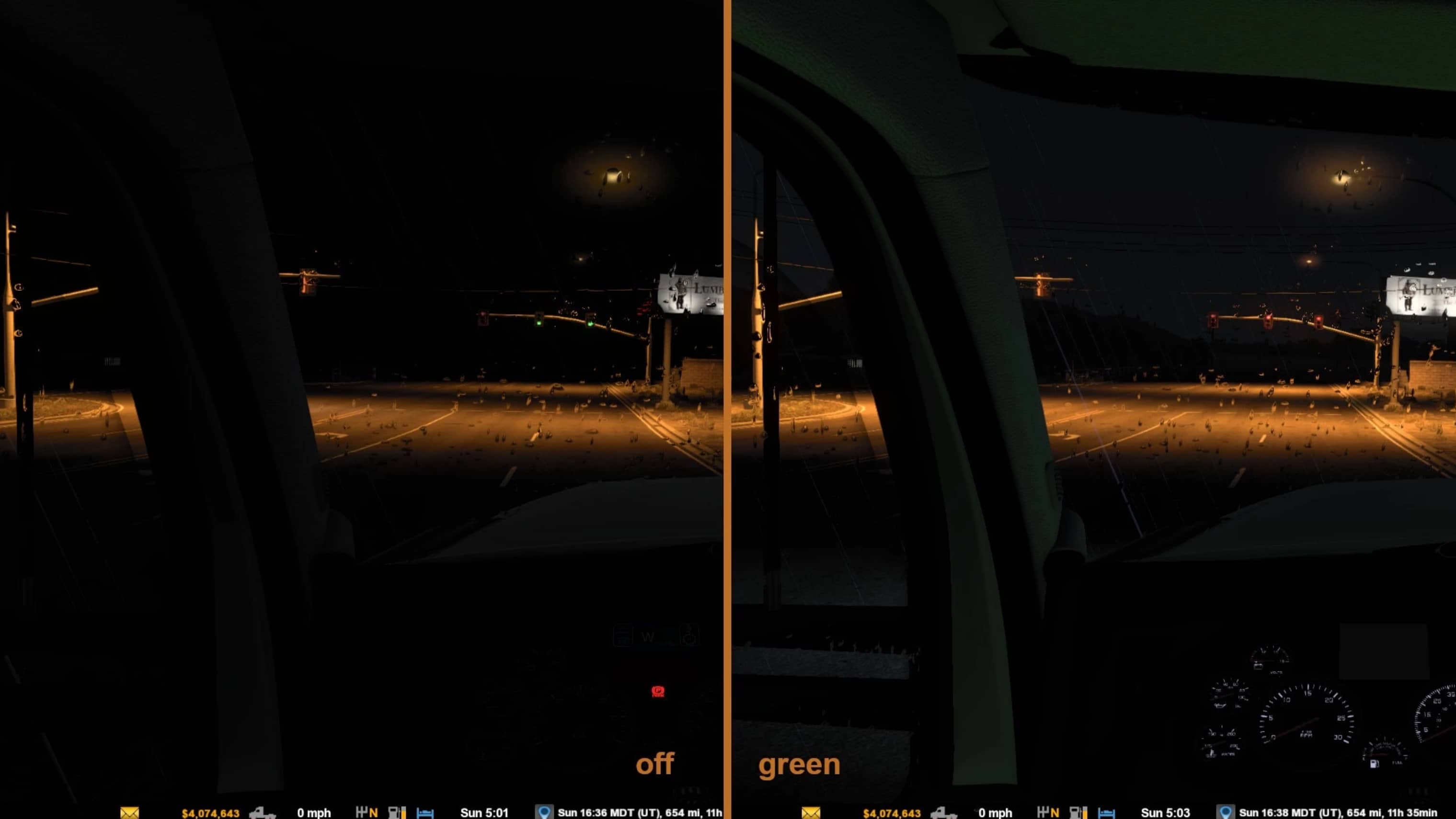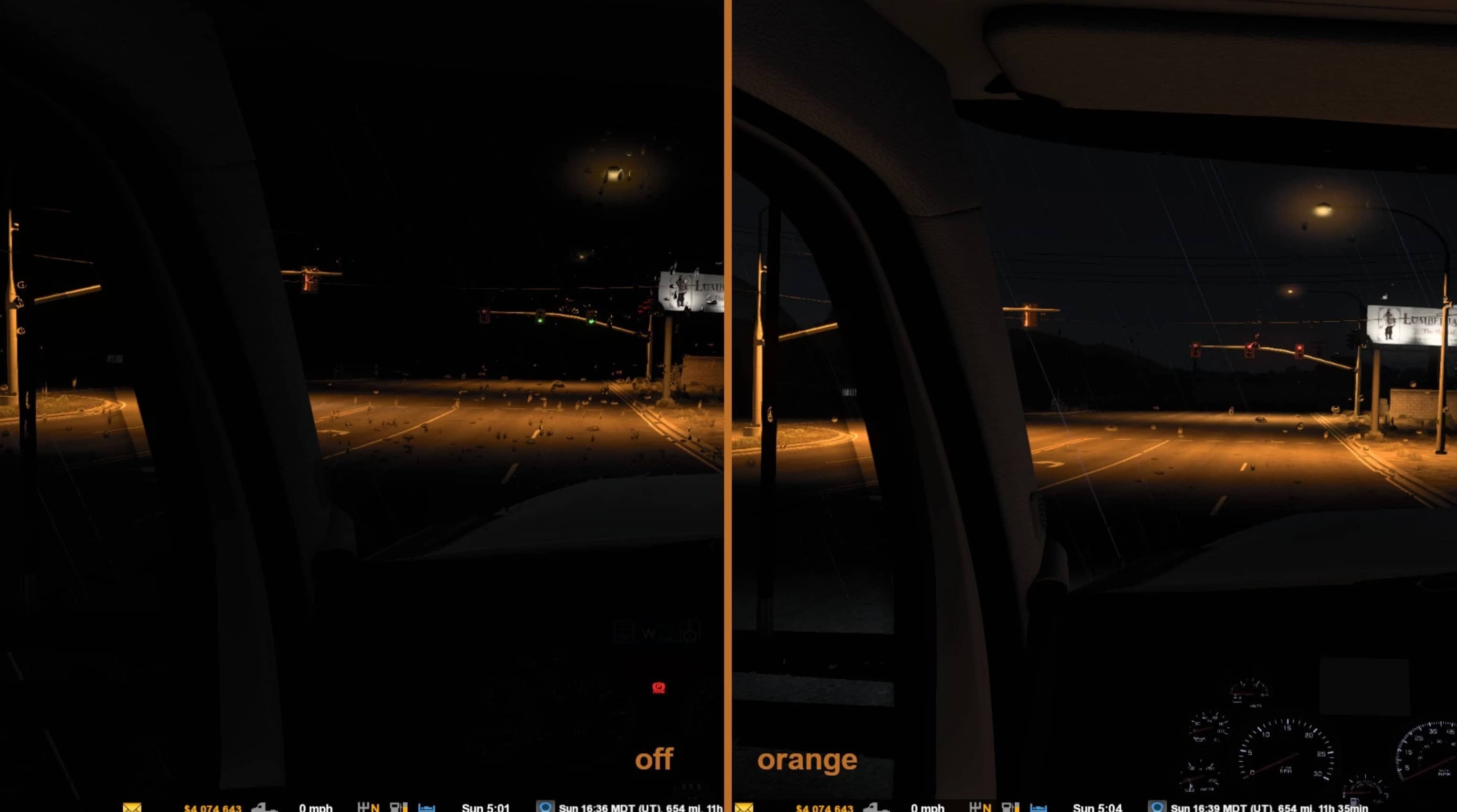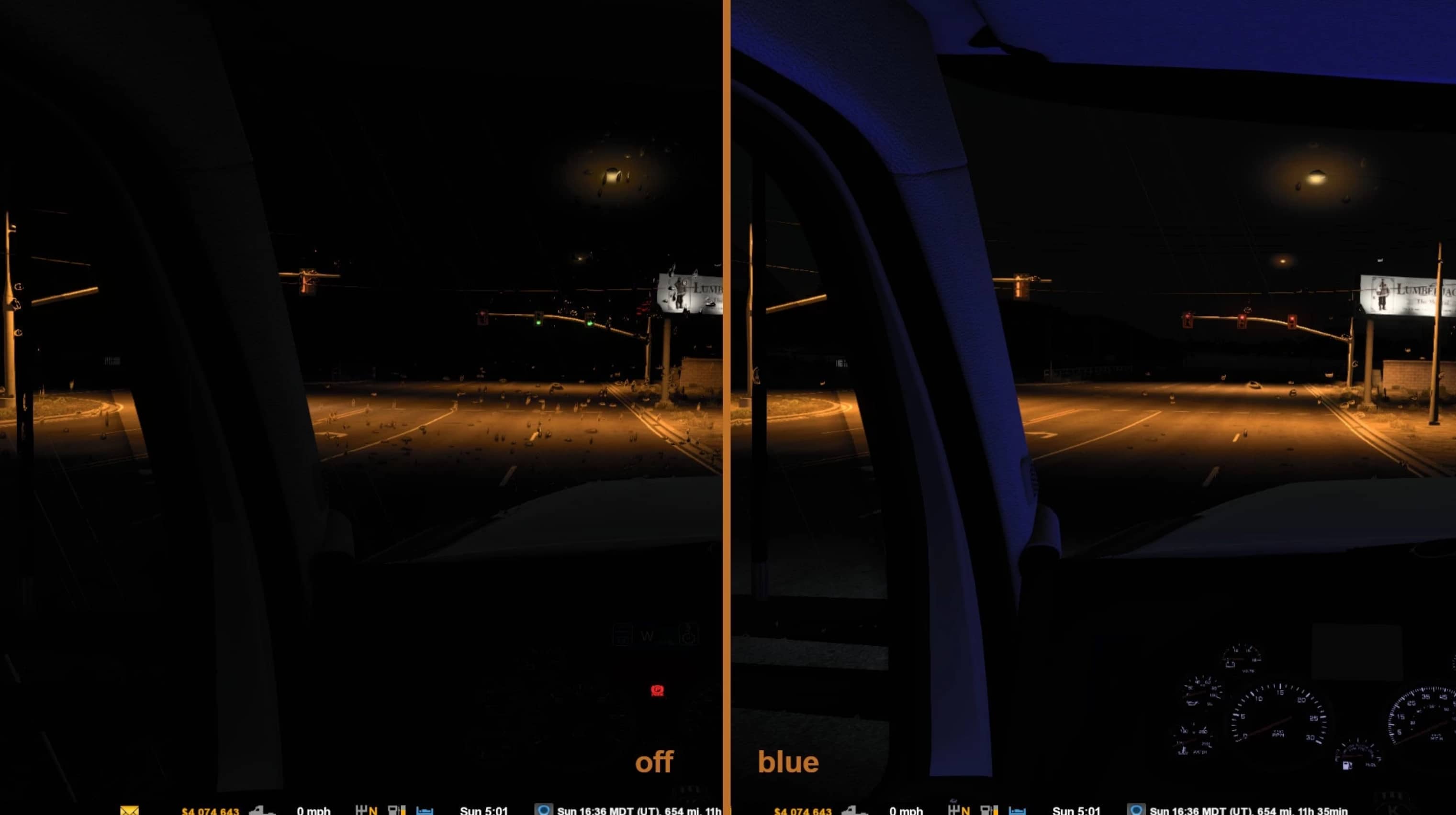 This mod provides interior cabin-light glow in choice of blue, green, orange, purple, red, and white for SCS trucks and mod trucks listed below.