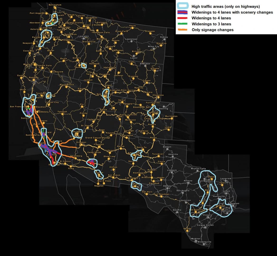 Credits: Mantrid – Lousiana completely rebuilt ShirBlackspots – Texas improvements Ways71 – Various scenery improvements along I-95