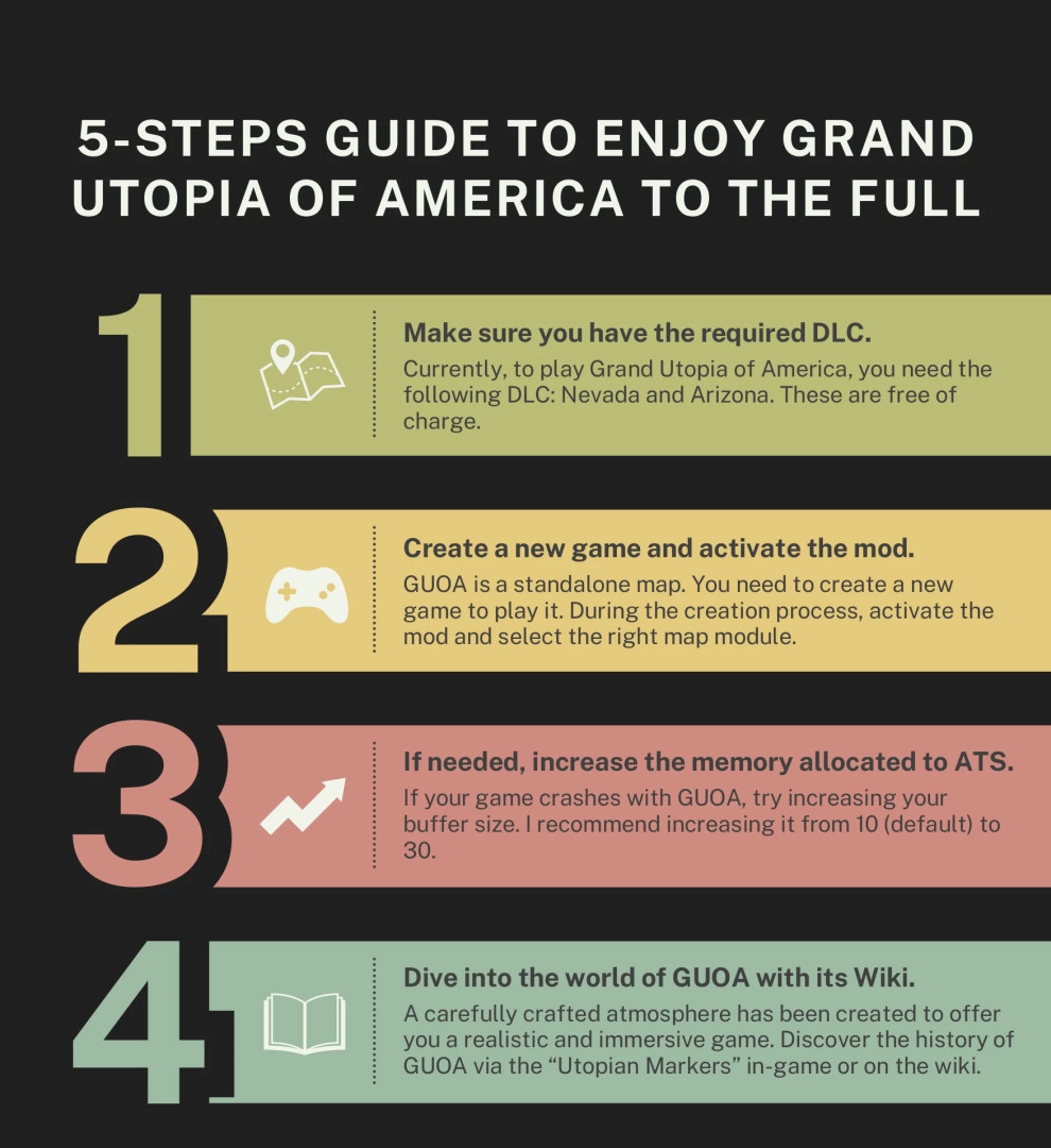But GUOA is more than just a map. This mod offers a deep roleplay universe, with an active community and detailed wiki to immerse you in the mysteries and history of this archipelago. All in true 1:1 scale! Explore, help shape the future and shape the destiny of Grand Utopia of America.