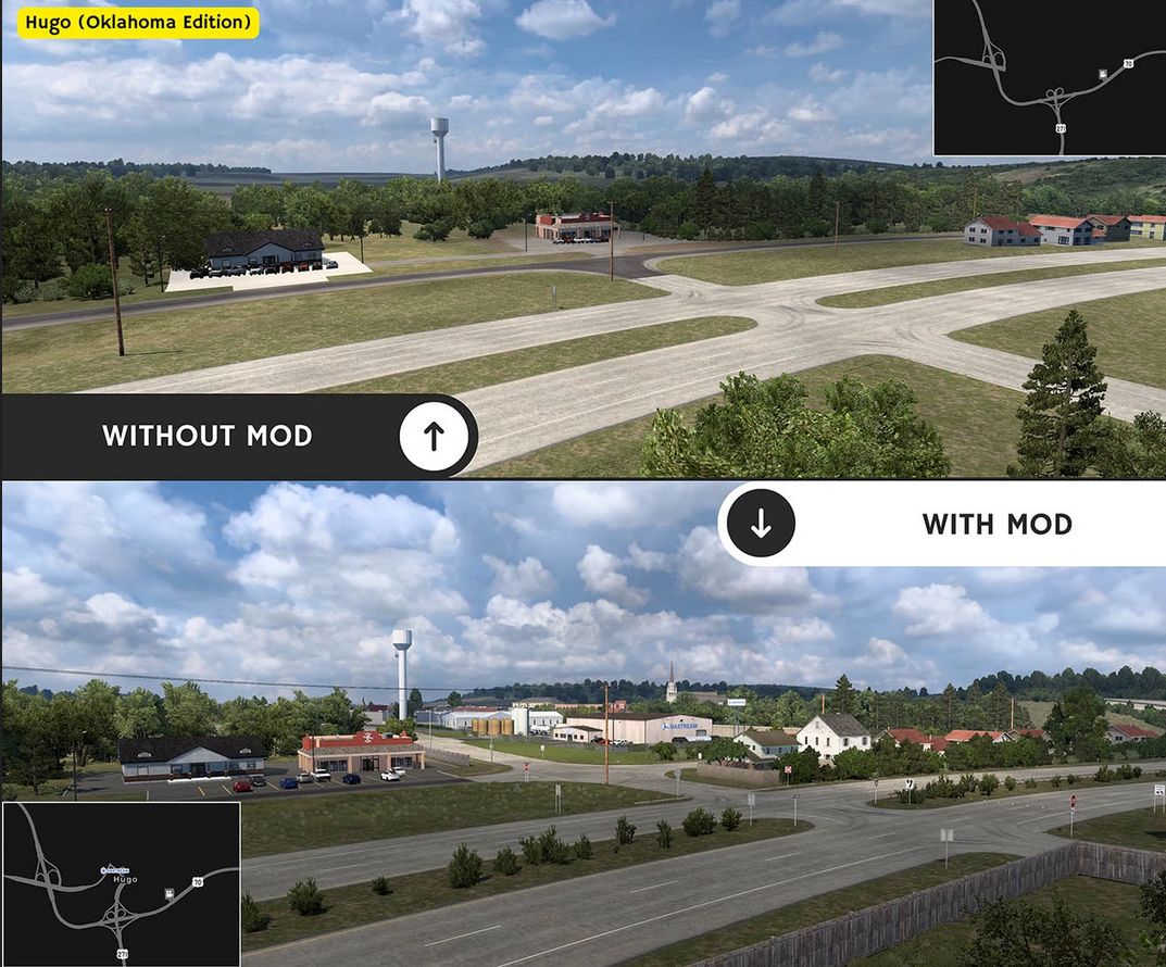 This mod makes some of the decorative towns featured on the base map playable using existing or brand-new delivery points. I advise you to place all the “More American Cities” mods as low down as possible in your mod manager to avoid any conflict with other modded maps. If you use more than one edition, please arrange them alphabetically in your mod manager, where A is at the top and Z is at the bottom. Please note that if you do not have the map extensions bordering the state of Oklahoma, some towns may not be playable despite their presence on the map.