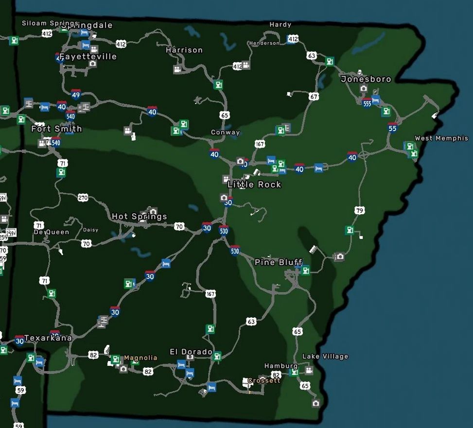 Map that shows the scenery towns in Arkansas and switches around some company definitions. Here is a list of scenery towns that the mod defines. Some will just be aesthetic.