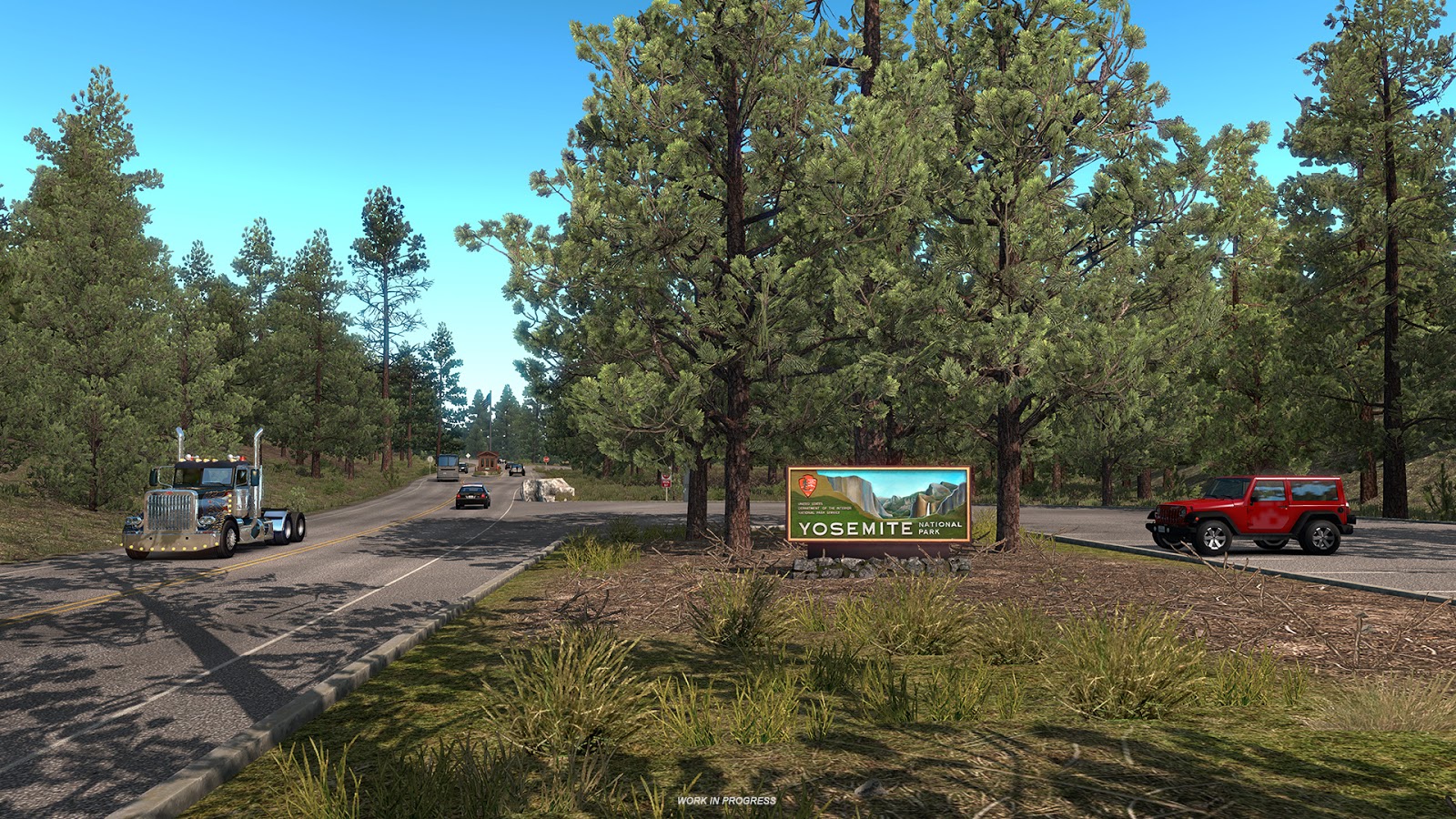 With the scale of our worlds compared to reality, we simply have to focus on major road arteries to form the road network. There is usually not enough room to even think about squeezing in any lesser roads. But we enjoy making exceptions and based on feedback from our fan community, so do the players. We have noticed a bit of empty space next to the Sierra Nevada, did a little research, and felt that it would be a great opportunity for one of our new map designers do cut his teeth designing a pass across the mountain range. There was just one small problem – typically commercial trucking is restricted in US national parks! Still, this region is so scenic and the task was so tempting, we decided to give it a go, and to find an excuse in the game for allowing the player to travel across the mountain pass.