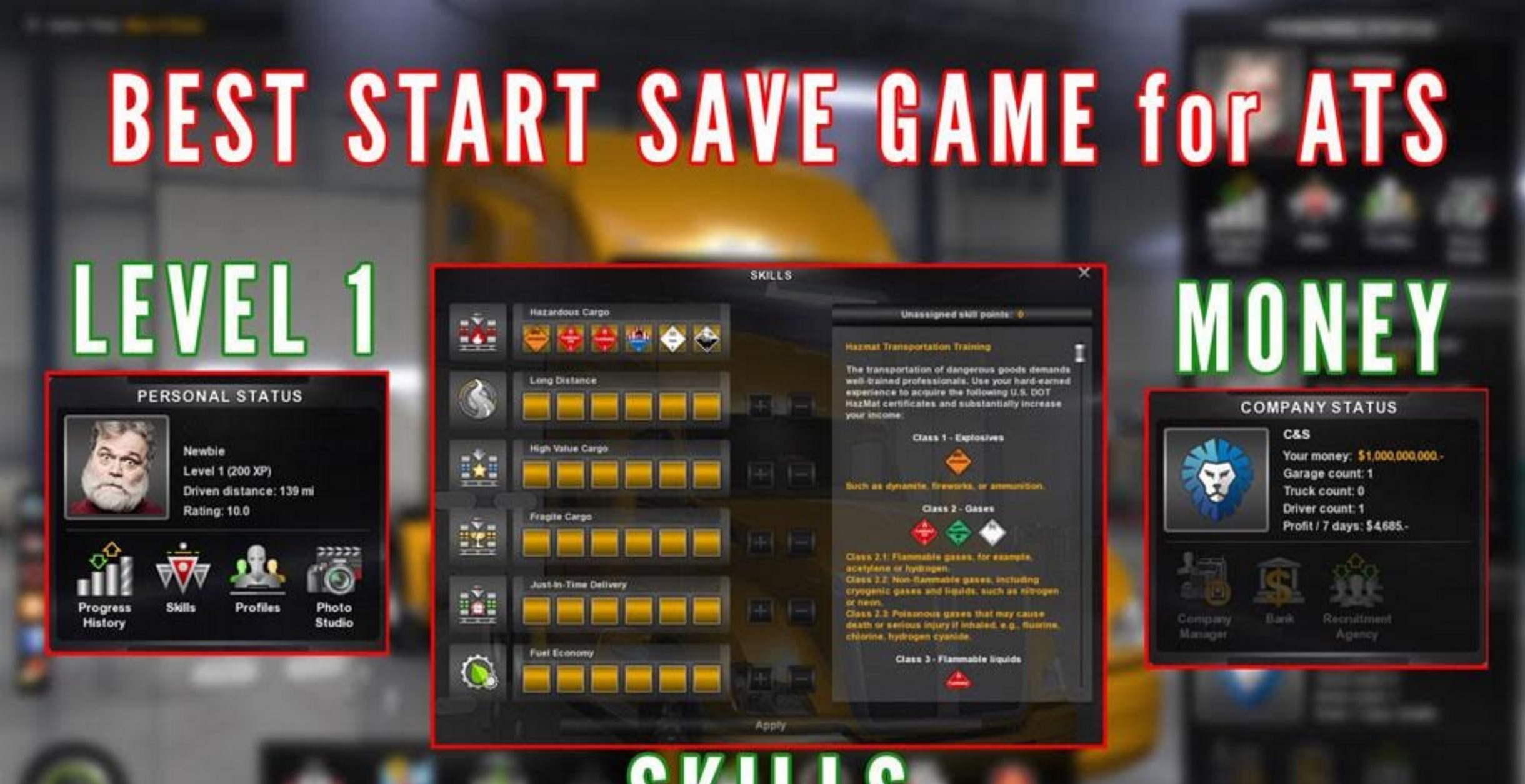 – Level 1 [All skill points are maxed] – 1,000,000,000€ Cash [To buy all the trucks you want] – Tested with ATS last version [should work for all versions] – How to Install: