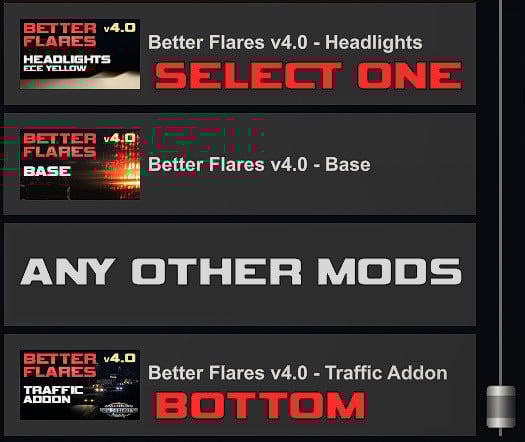 Better Flares 3.1 is an adapted version of Better Flares 3.0.1, with converted textures to latest. Compatible with ATS 1.39. Removed everything that caused trouble, so you should have a crash game.
