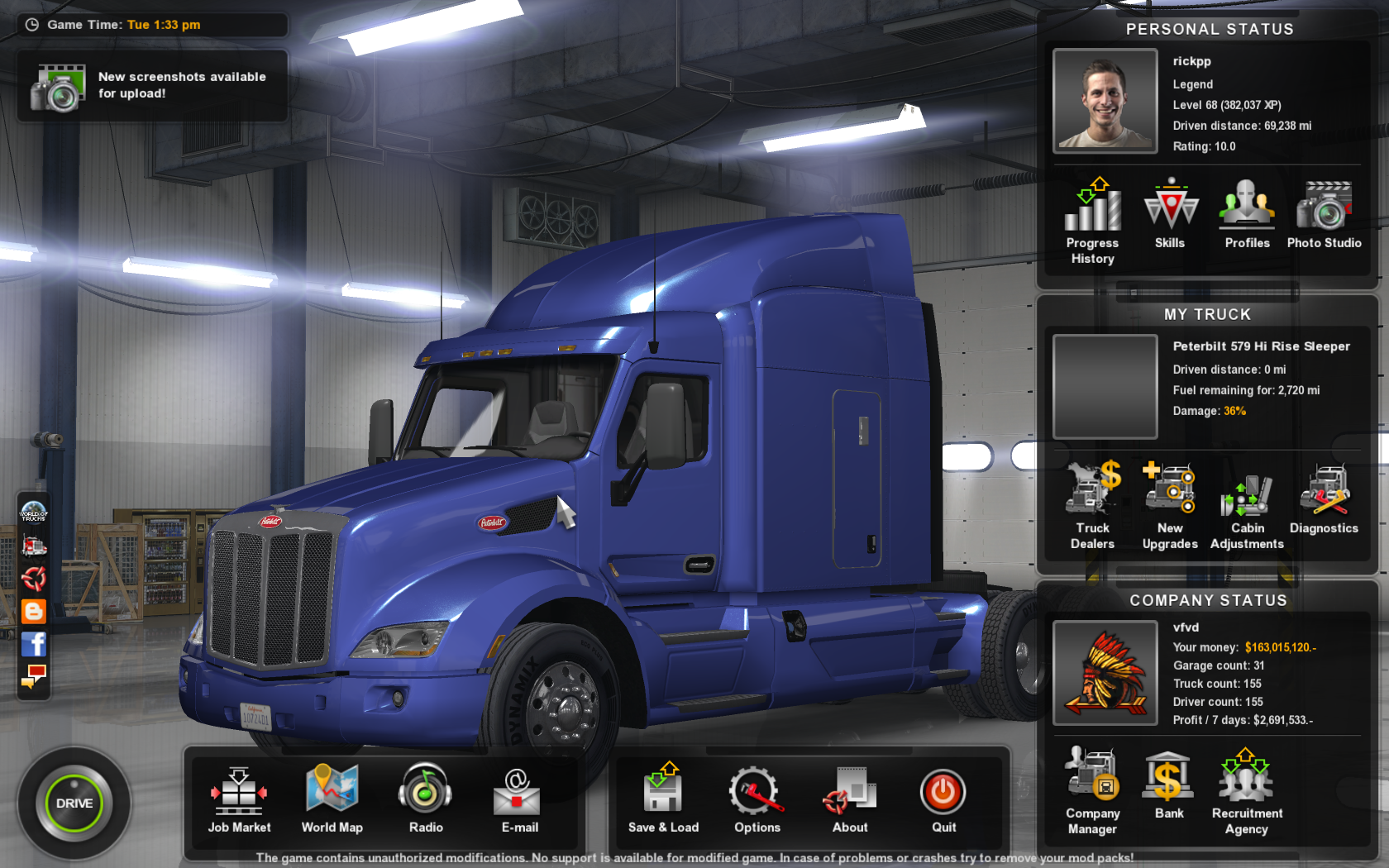 Game tip: If you are hauling a heavy load on the interstate & do not like people passing you cuz you are slow, turn on your hazard flashers(F)…….No one will pass you no matter how slow you are going. It cuts back on the idiot speed demons that are in too much of a hurry as well as your damage factor. ENJOY!!!!!