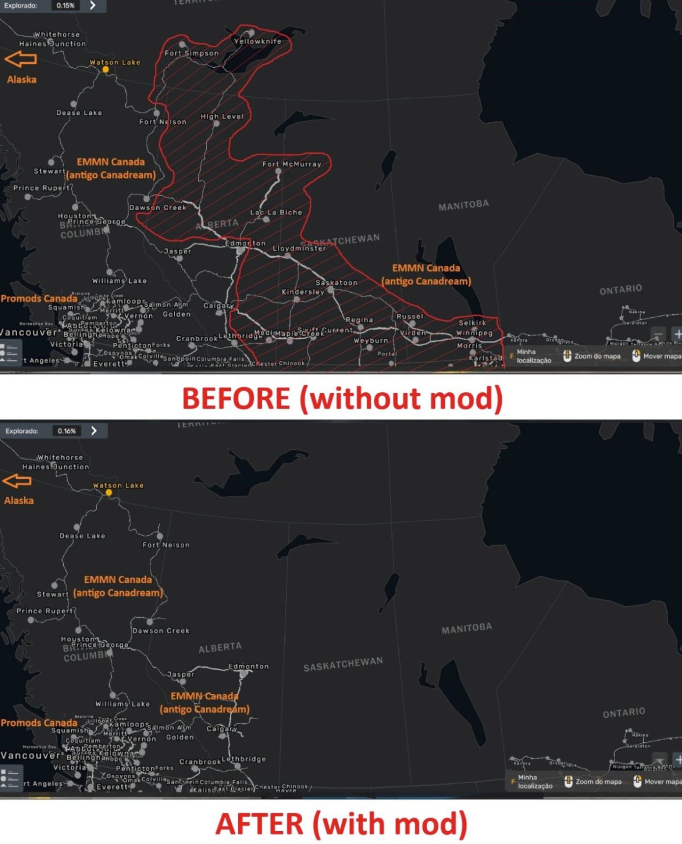 – Overwritten the areas of Canada (EMMN) inherited from the old CanaDream/CanaMania. Only what is necessary to connect to the Alaska North to the Future map, in addition to the cities of Edmonton and Calgary, was retained;