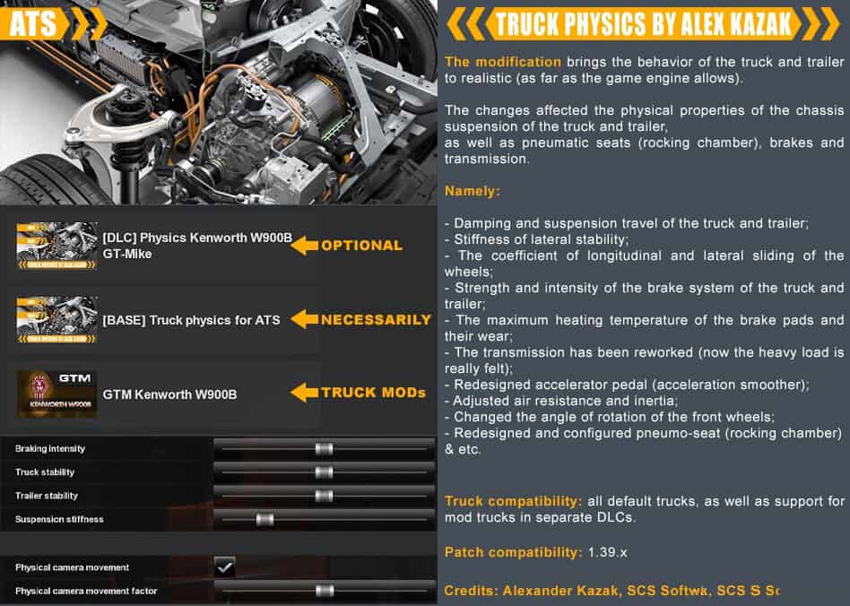 The modification brings the behavior of the truck and trailer to realistic (as far as the game engine allows). The changes affected the physical properties of the chassis suspension of the truck and trailer, as well as pneumatic seats (rocking chamber), brakes and transmission.