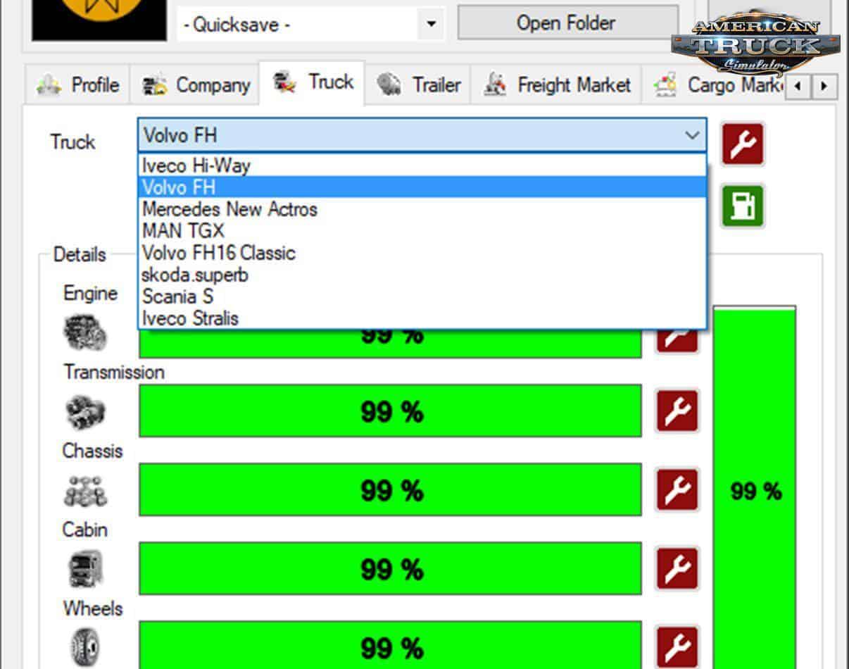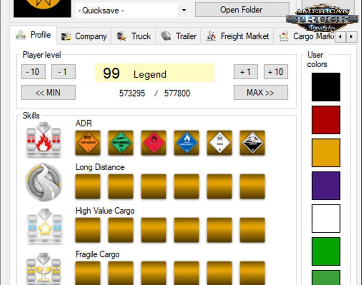 TS SaveEditor Tool – this program is designed to edit save files.Works with both ETS2 and ATS. This tool is in alpha state and can broke save file so be caution. With this program, players will be able to change their level and skill, as well as the company headquarters and the amount of money in the account, edit the saved colors of trailers and trucks, repair or refuel their truck, share truck skins, customize custom colors, create custom work for the freight market, make major changes to the freight market, share GPS coordinates and paths that can be useful for convoys.