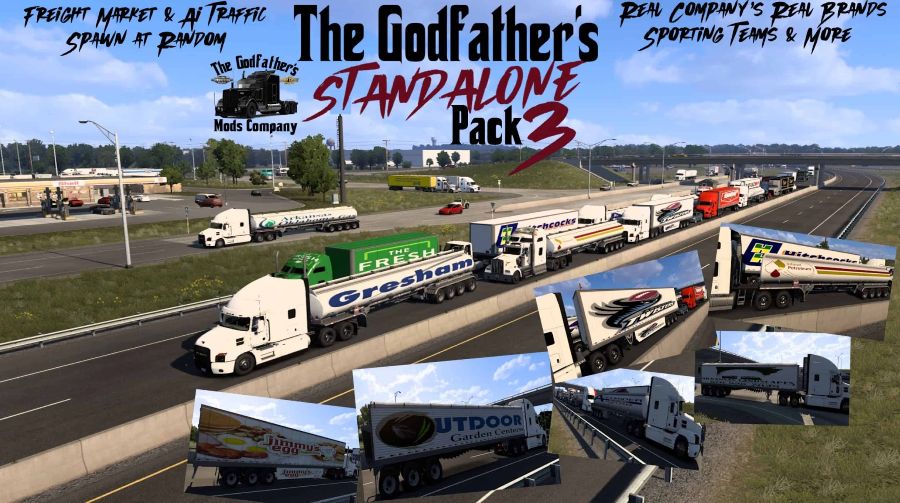 The Godfather’s Standalone Pack 3 is a Pack that spawns Real Life Company’s Real Life Brands Real Life sporting teams and even loads of Arkansas USA Real Life Company’s and Sporting teams and Brands as part of the september 2024 DLC into the Traffic Flow and World of Trucks freight market and normal freight market at random with Box Trailers ranging from 53ft,43ft & 28ft To 50ft Grainhopper Trailers To 53ft Fuel Tankers plus we have matching trucks to go with the trailers that spwan in the traffic flow only. This pack has a total of 260 skins that spawn at random and has been built to make your trip into the Arkansas DLC More real.
