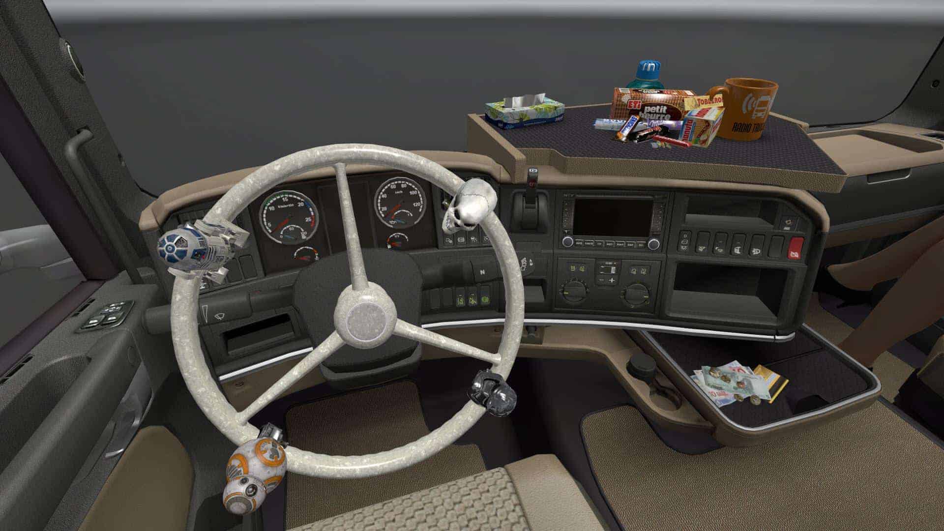 This mod contains over 400+ cabin accessory items suitable for your taste, bringing female and male co-drivers, bobbleheads, accessories for truck driver needs, snacks, electronic devices, computers and tablets, lots of scarves, fresheners, toys and many many more…