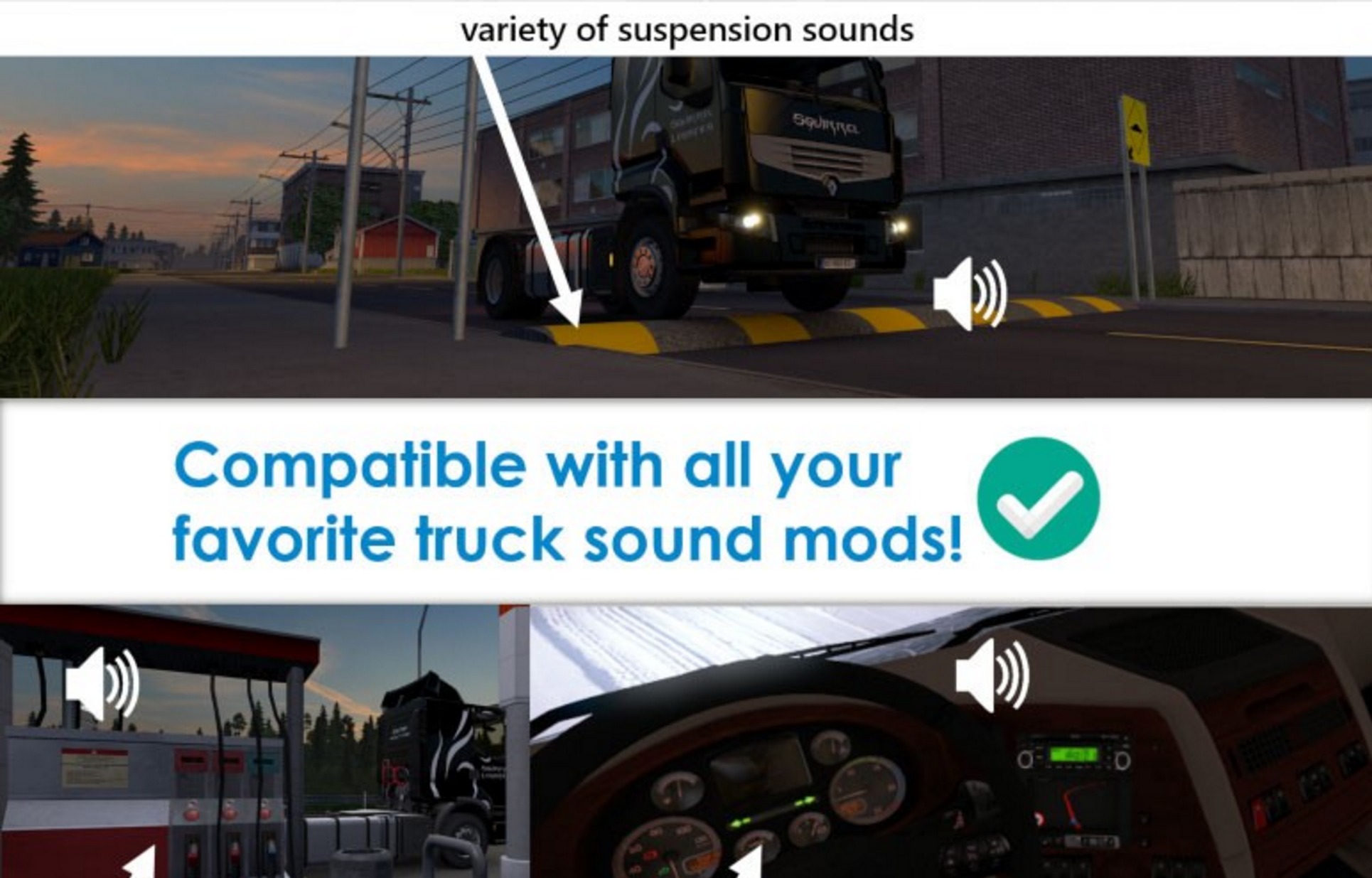 Does not replace individual truck sounds, so can be used with an unlimited amount of truck sound mods of your choice.