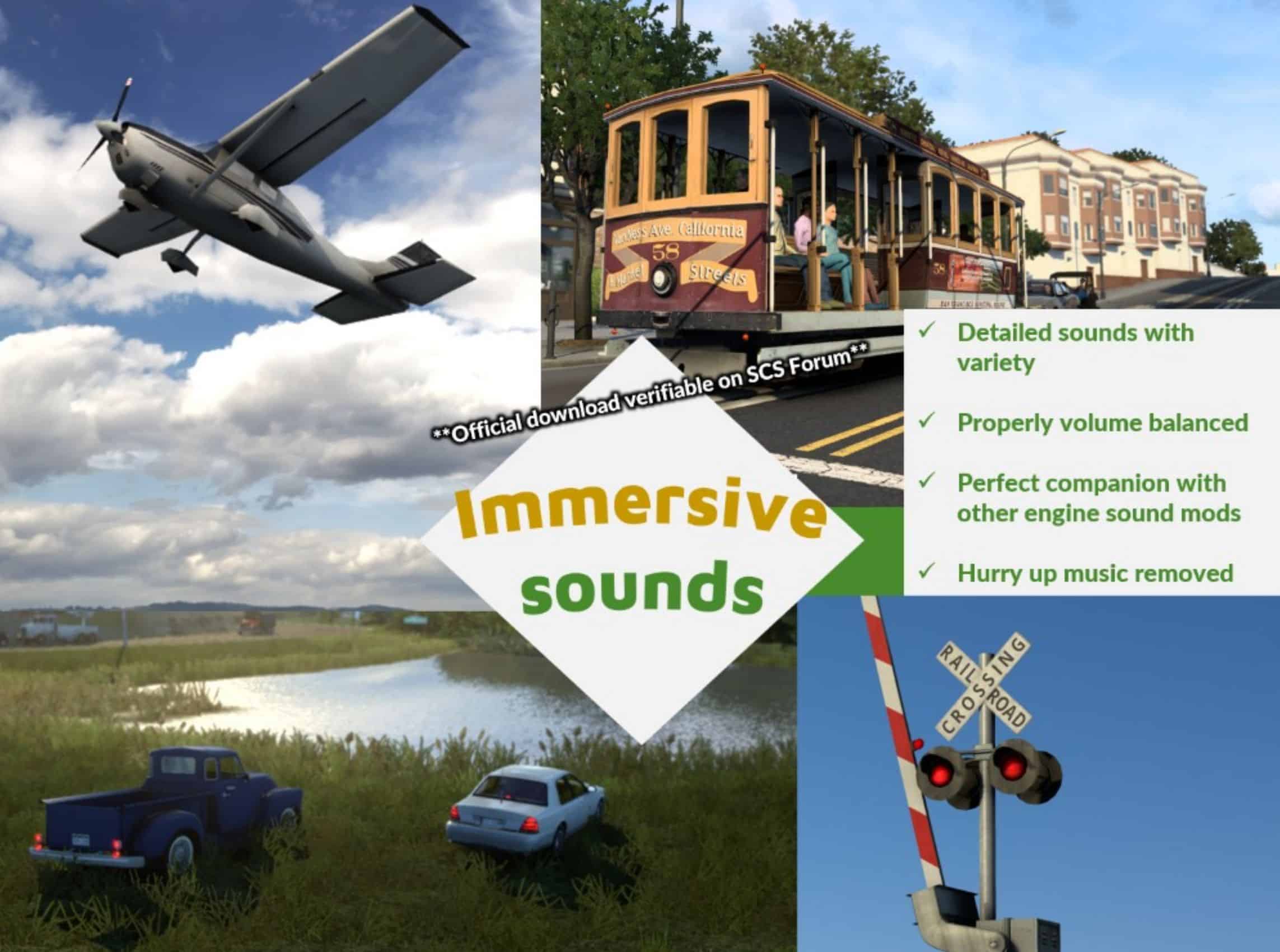 – Real tire and road noise for all terrains: asphalt, gravel, grass, snow, and sleeper lines.