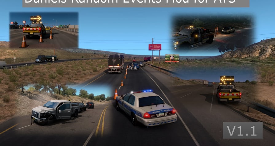 This mod adds 70 new random events (many of which have many different possible variations) to appear on the roads in ATS.