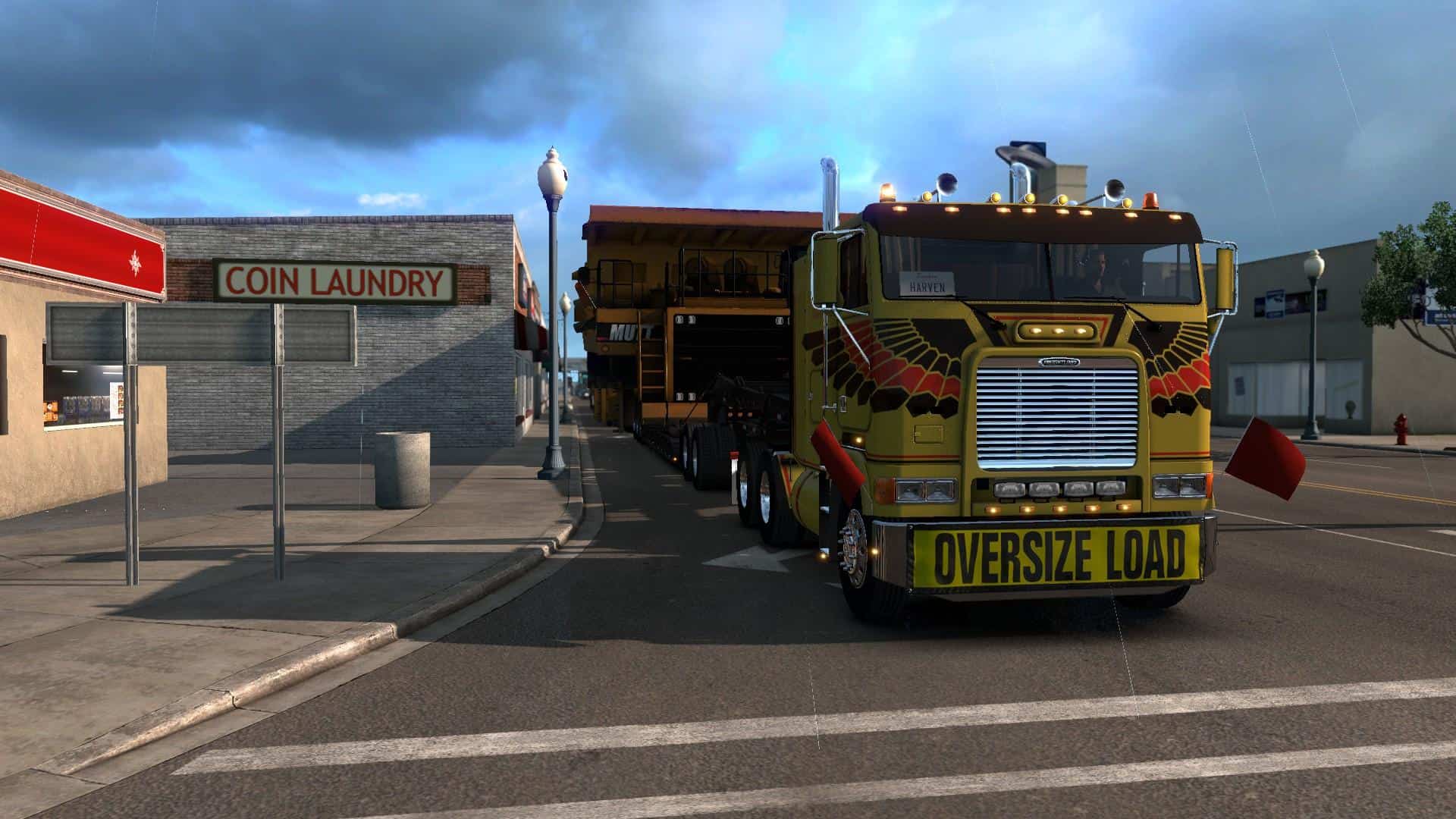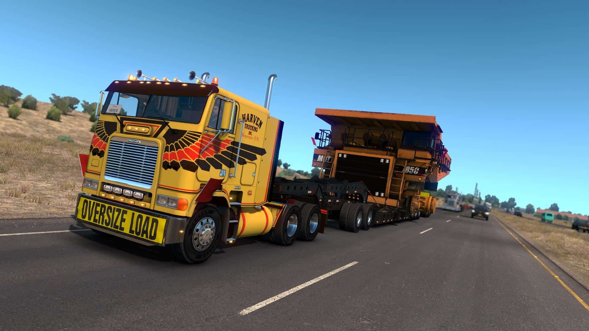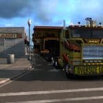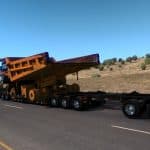 It requires Heavy Cargo Pack DLC because it uses some resources from that pack (jeep, spreader and some textures). The trailer provided with this mod is a modified 3 axle “Lowboy 55L” (aka Magnitude 55L) with added spreader attachment. Note: this load is very wide, wider than any currently available cargo in ATS – that might cause some issues.