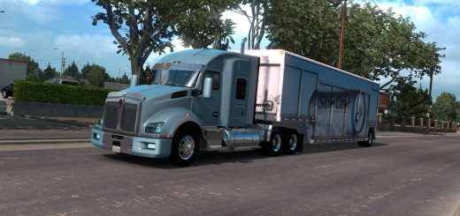 It requires Heavy Cargo Pack DLC because it uses some resources from that pack (jeep, spreader and some textures). The trailer provided with this mod is a modified 3 axle “Lowboy 55L” (aka Magnitude 55L) with added spreader attachment. Note: this load is very wide, wider than any currently available cargo in ATS – that might cause some issues.