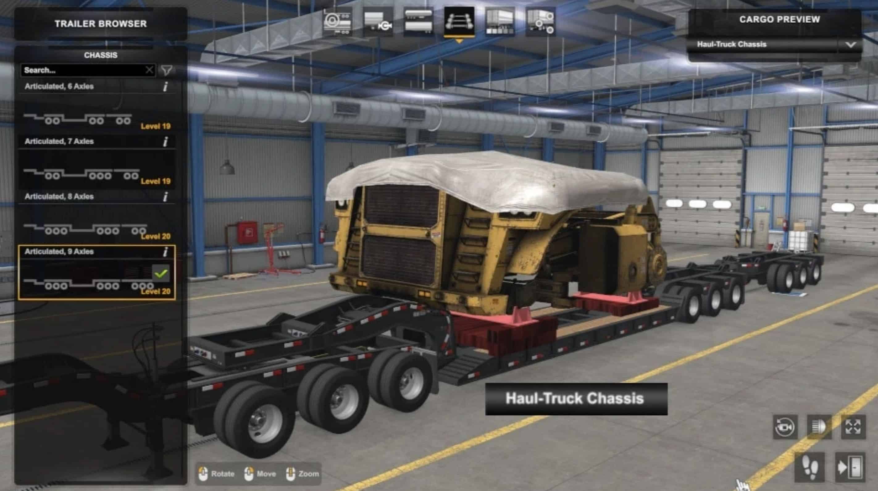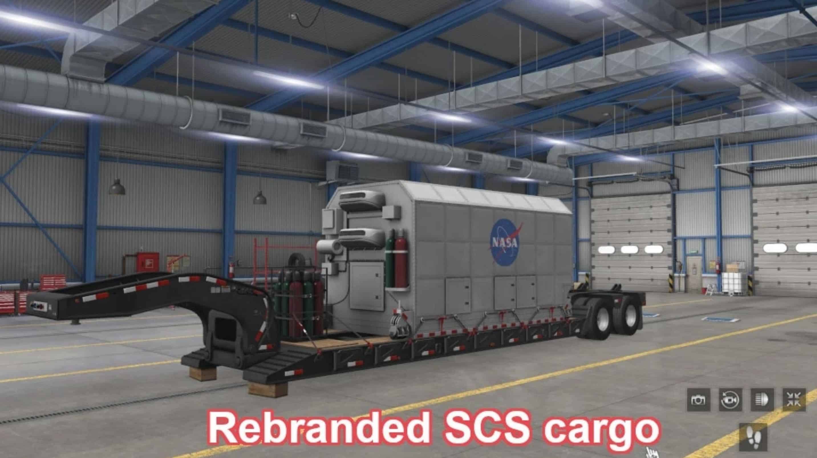 – Custom cargoes exist for ownable, freight-market, traffic, and parked lowboys; traffic and parked trailers for custom cargoes have Vanilla/Red paint. Many SCS cargoes are branded (e.g., CAT, Doosan, Hitachi).