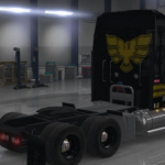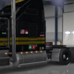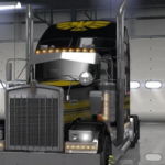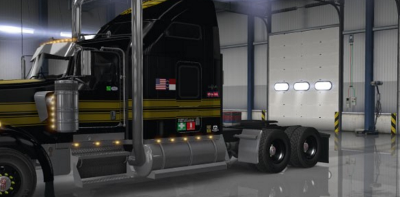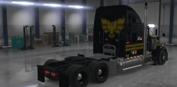 Loosely based on the Snowman’s truck [“Smokey & the Bandit”] and on the Pontiac Firebird logo, this truck skin is black and dark gold. Includes the following decals: USA and NC flags, Cali Clean Idle sticker, Nevada IFTA stickers, ALCOA logos, ‘Toys For Tots,’ ‘Semper Fi,’ ‘Step Up For Soliders,’ ‘FIRST AID/FIRE EXTINGUISHER’ stickers, Crazy Riggers decal, and of course a Firebird logo on front and back, along with a hood topper pattern.