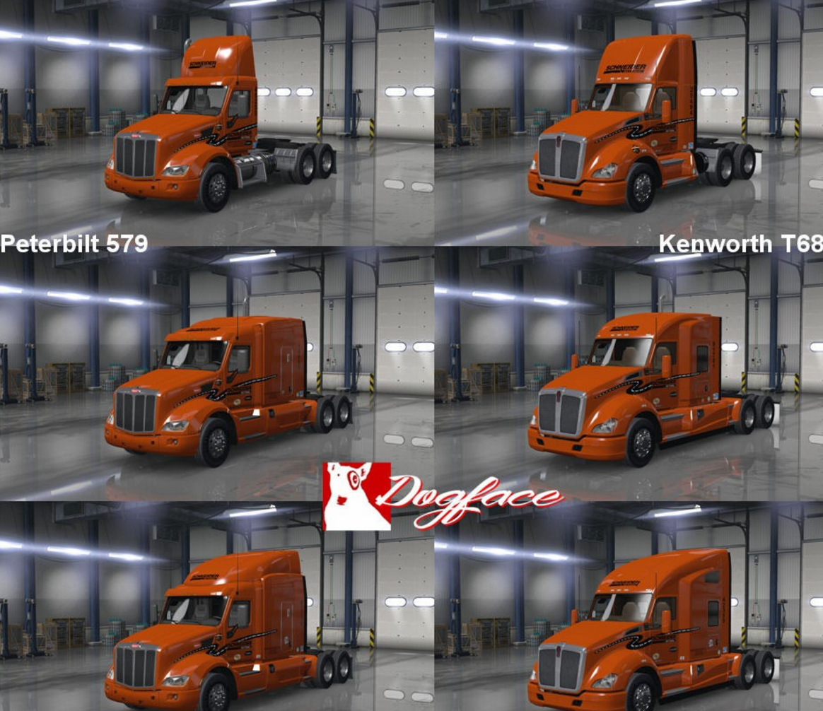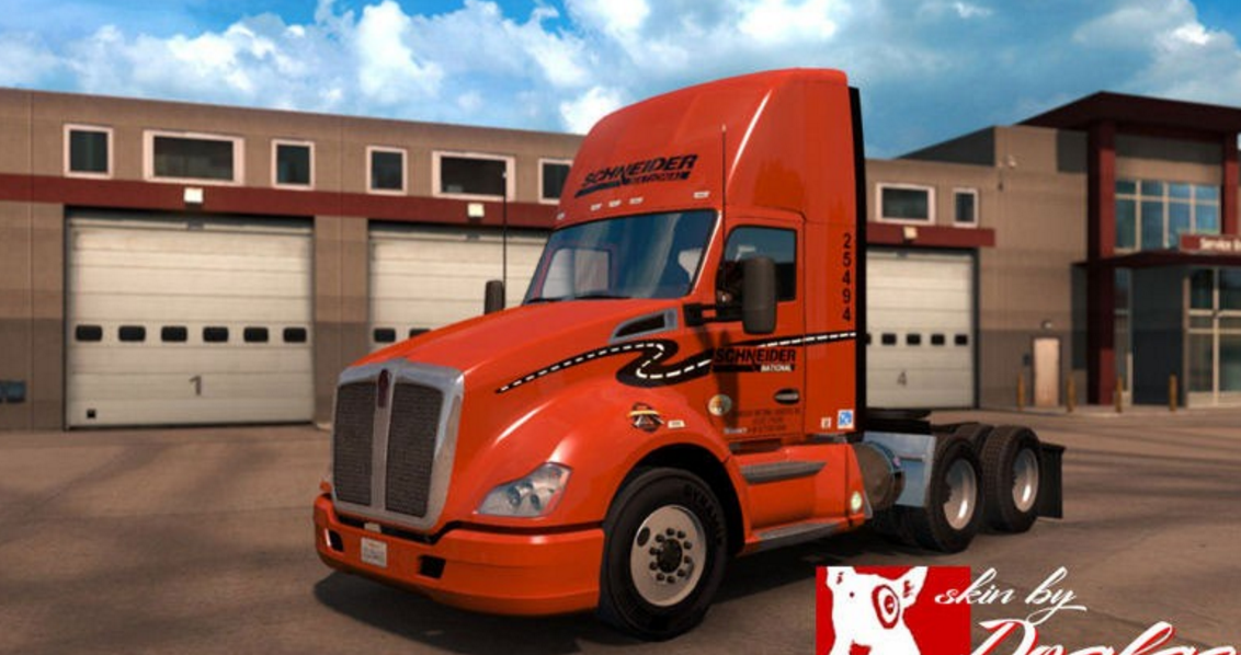 Schneider National is one of the larger American trucking companies. They run almost exclusively Freightliners, but until Freightliners are available in the game I will have to skin the trucks that are in-game. The decals are authentic to the truck company, and the day cab has the appropriate intermodal stickers. And there is an Easter egg on the deck behind the cab on the mid-roof and high-rise cabs.