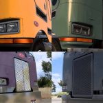 grills, headlights, front bumpers, rear bumpers, visors, fenders, lights, horns, exhausts, mudflaps, lightbars, beacons, tanks, stairs, window chops, interior accessories, roof wings, grill covers, tanker covers